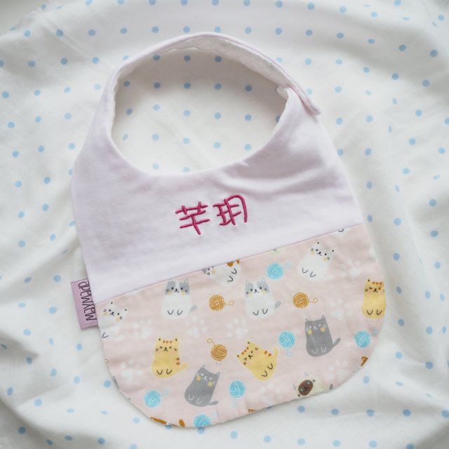 粉紅色貓貓圖案 拼布款繡名口水肩