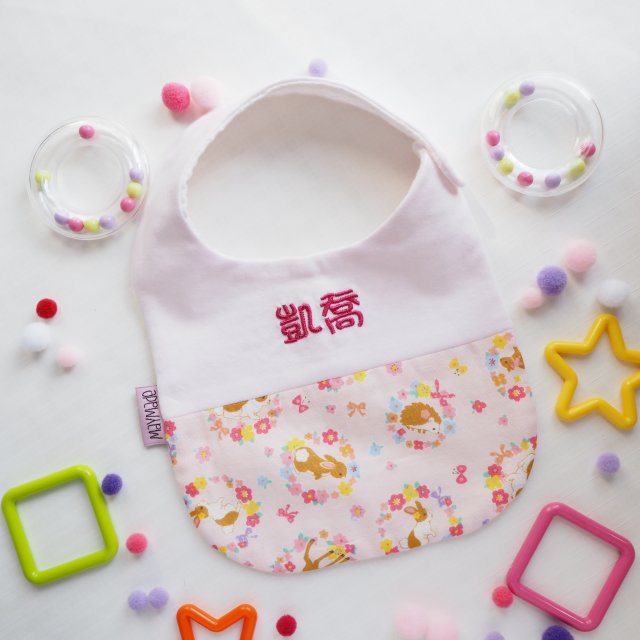 粉紅色花環動物圖案 拼布款繡名口水肩