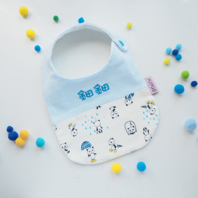 藍色雨中熊貓圖案 拼布款繡名口水肩