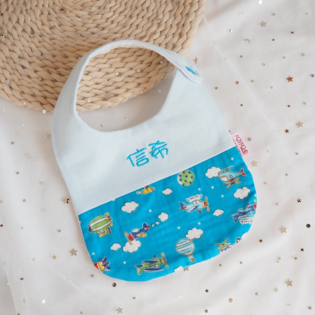 飛機與熱氣球 二重紗布圖案 拼布款繡名口水肩 [三色可選]