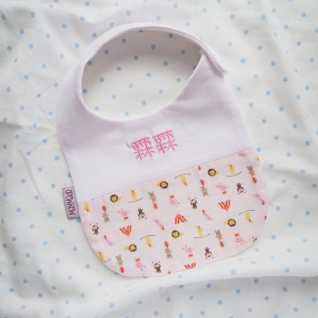 粉紅色馬戲團圖案 拼布款繡名口水肩