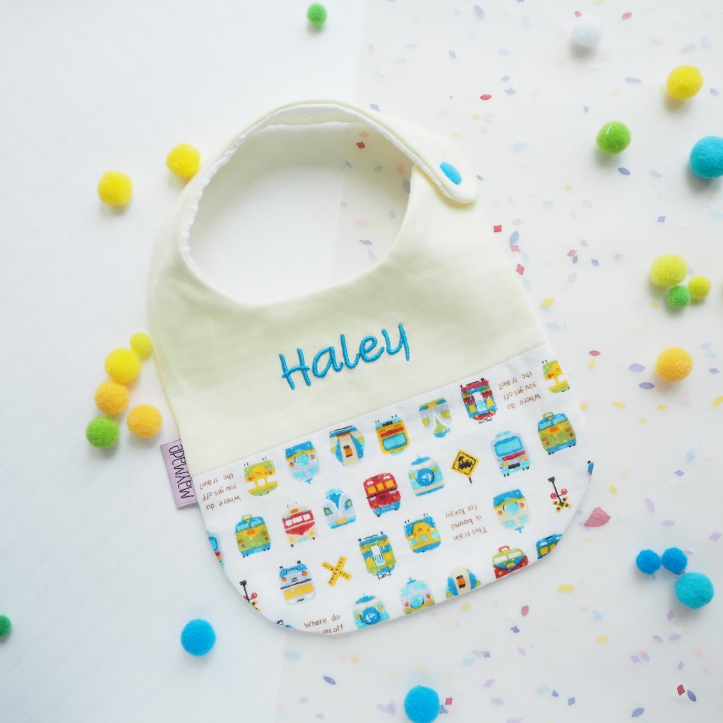 白底火車圖案 拼布款繡名口水肩