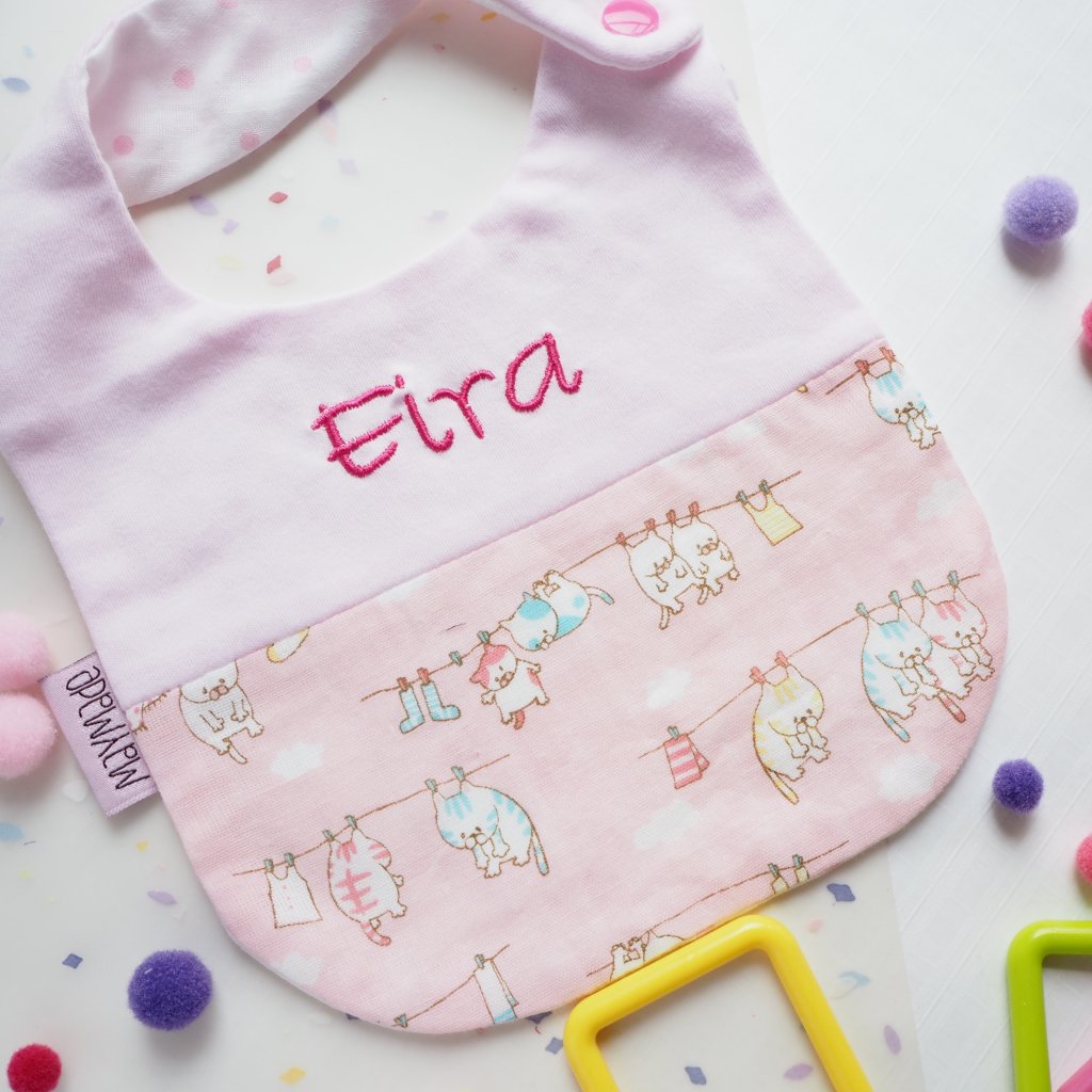 粉紅色貓貓圖案 拼布款繡名口水肩