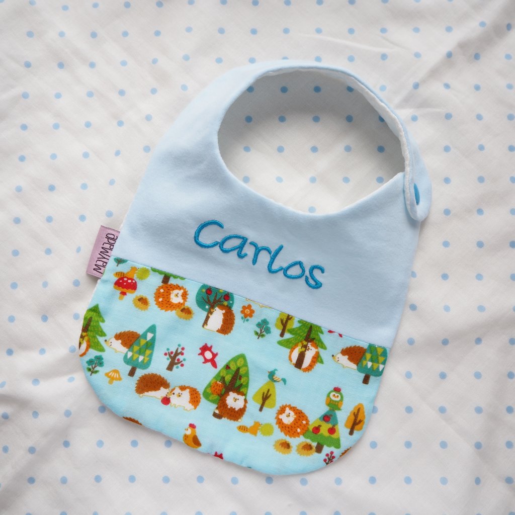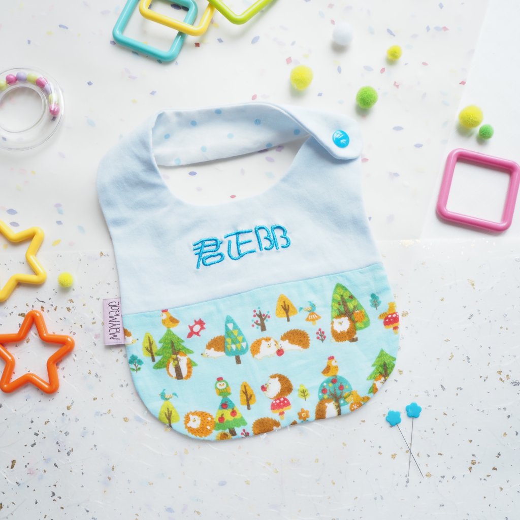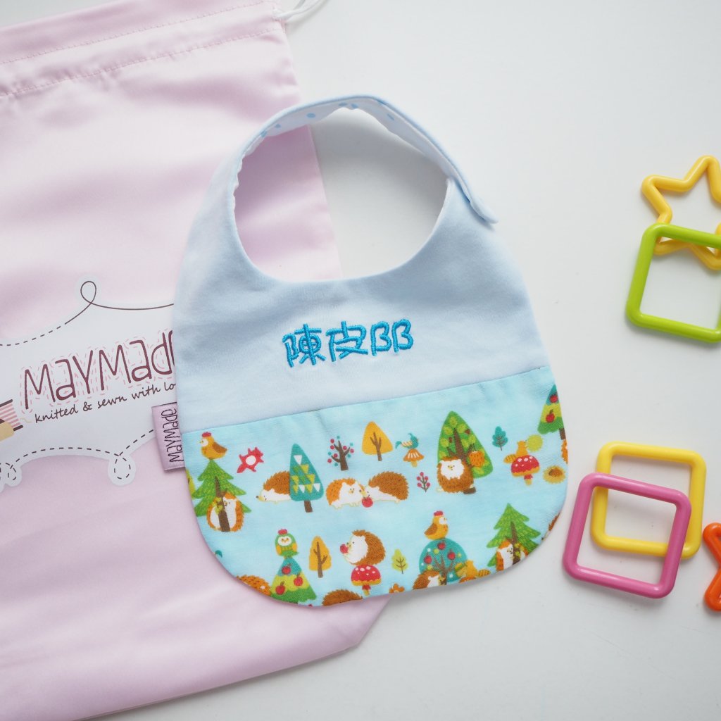 [SALE] 藍色刺猬圖案 拼布款繡名口水肩