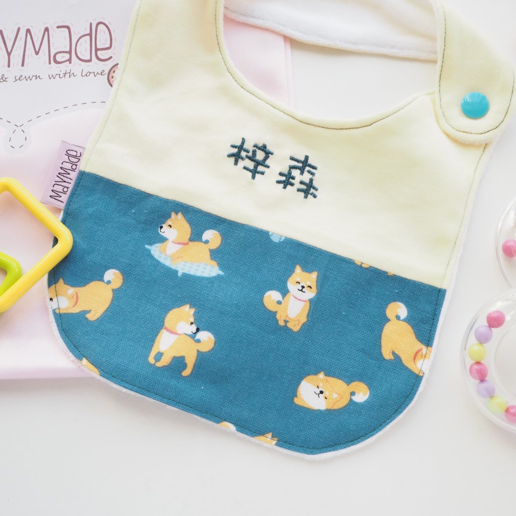 綠色柴犬純棉布圖案 拼布款繡名口水肩