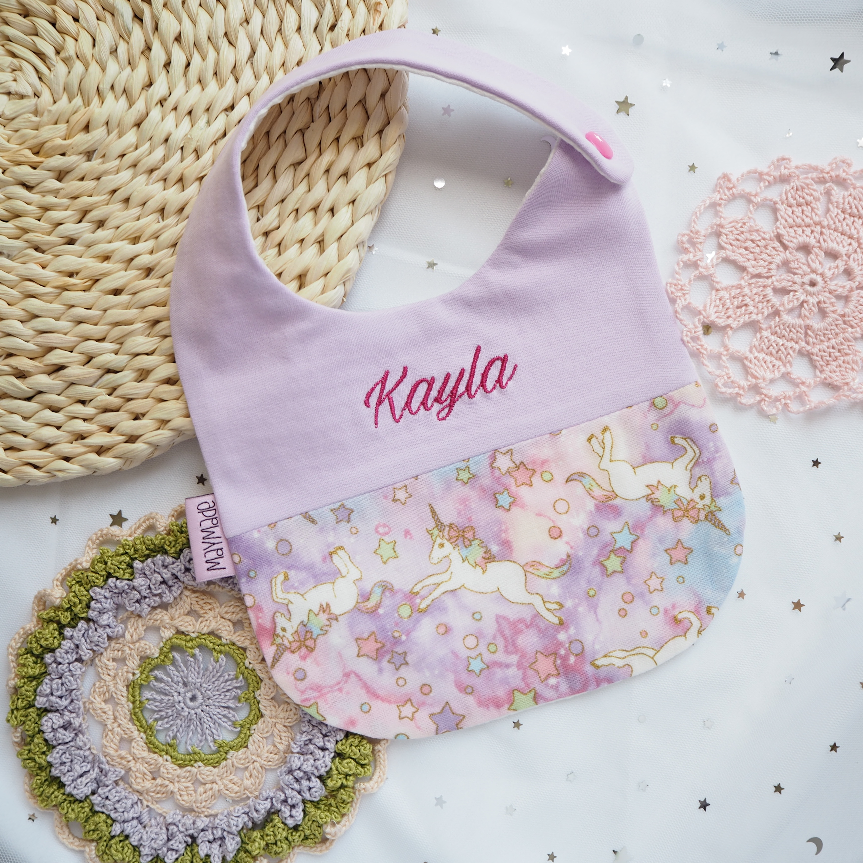 紫色獨角獸圖案 拼布款繡名口水肩